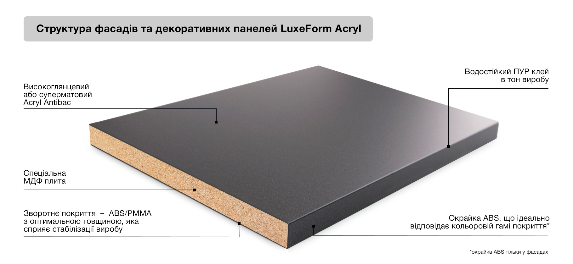 LuxeForm Acryl – колекція декоративних плит та фасадів, що вирізняються стильним дизайном та насиченим кольором. Заворожуюча і загадкоа, гармонійна і надійна поверхня акрилових фасадів заповнює простір, додає шарму всьому дизайну.