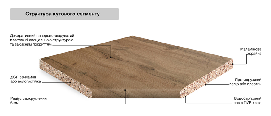 Кутовий сегмент – елемент стільниці у формі трапеції для створення кутової кухні. Завдяки кутовому елементу з’являється додатковий ергономічний робочий простір.